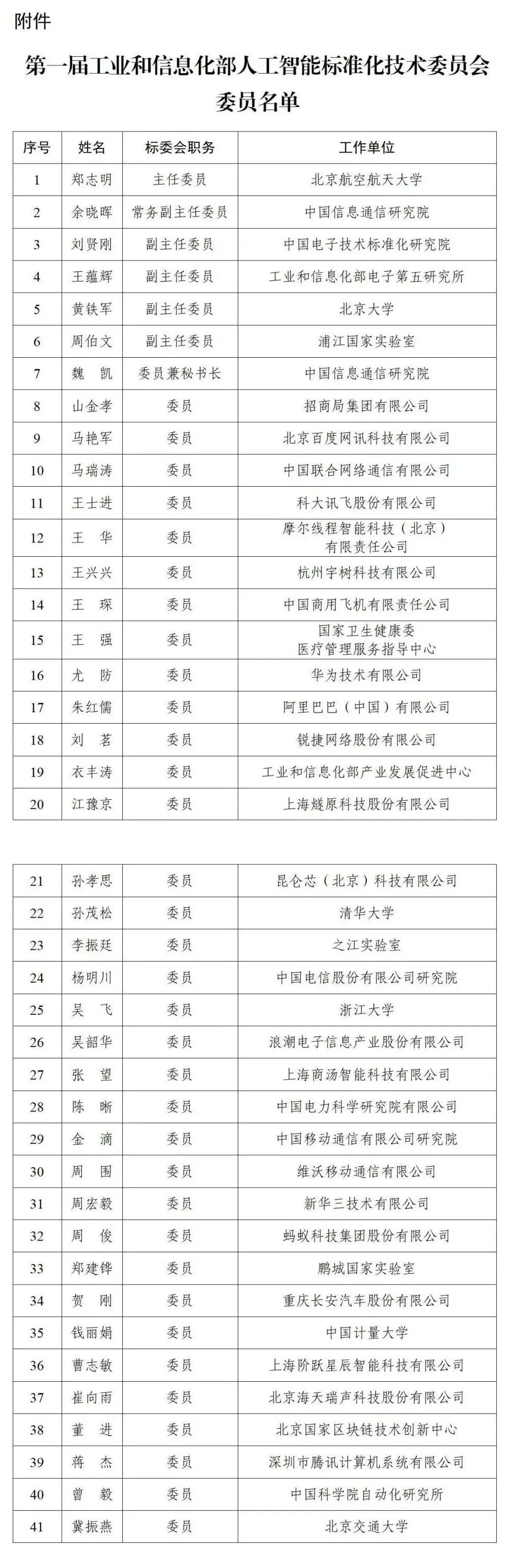 第一届工信部人工智能标准化技术委员会由41名委员组成,秘书处由中国信息通信研究院承担,北京航空航天大学教授郑志明担任主任委员。