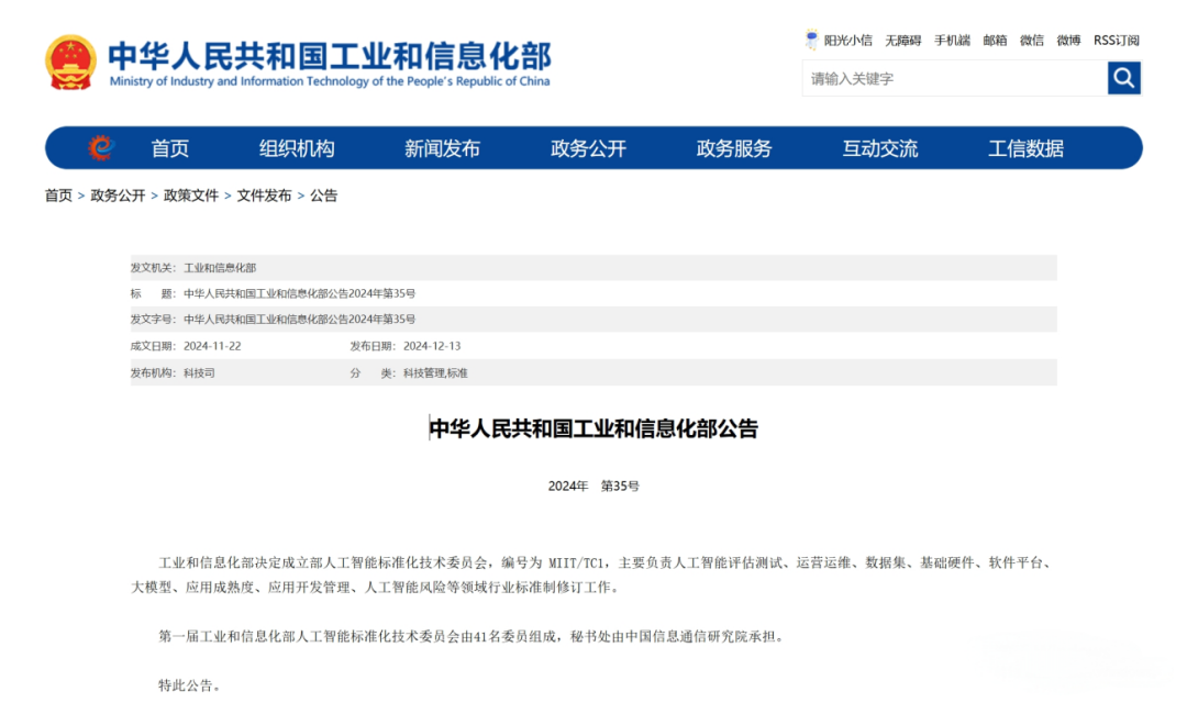 12 月 13 日,工业和信息化部决定成立人工智能标准化技术委员会,编号为 MIIT/TC1,从其负责的领域来看,涵盖了人工智能评估测试、运营运维、数据集、基础硬件、软件平台、大模型、应用成熟度、应用开发管理、人工智能风险等诸多关键方面的行业标准制修订工作。这一举措具有极为深远的意义,它将在人工智能的多方面领域发挥关键的规范与引领作用。